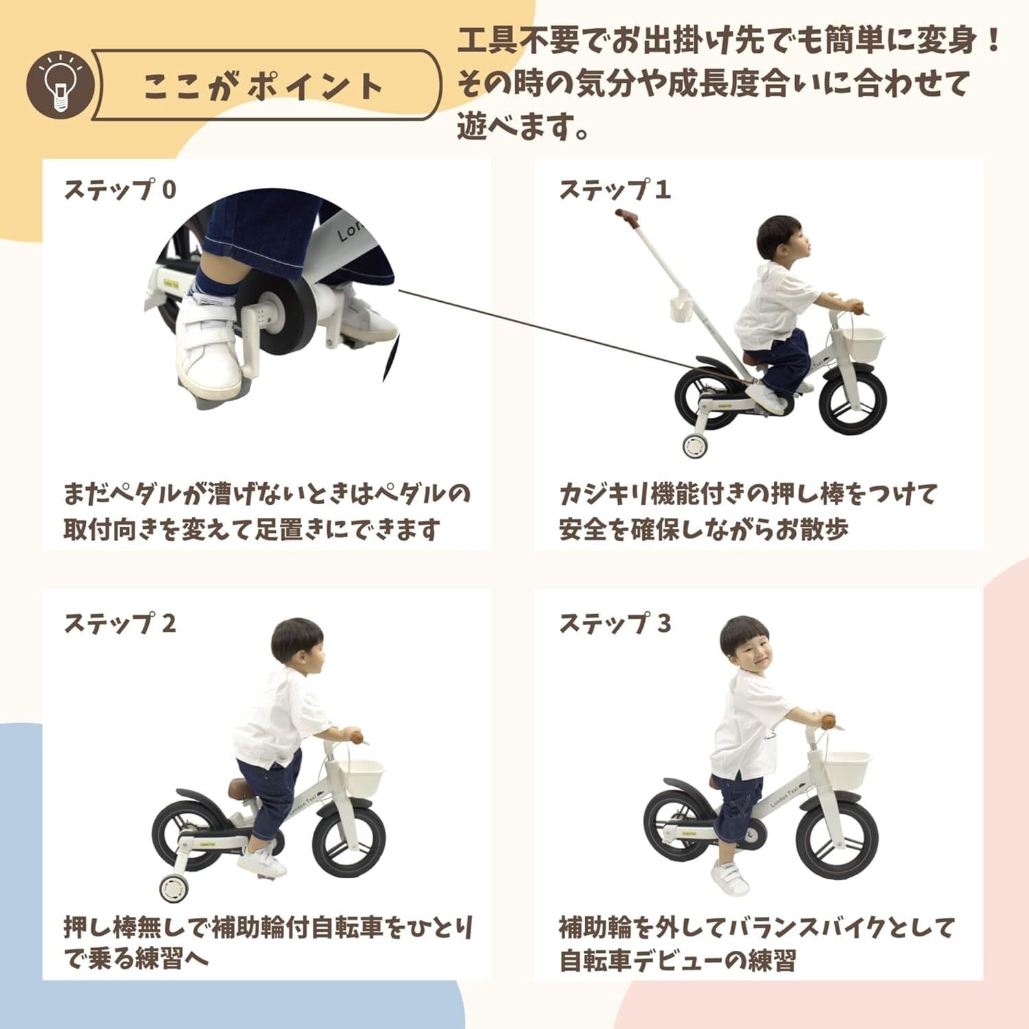 一人でこげないお子様でも安心、ハンドル操作のできるカジキリ押し棒と補助車付き。押し棒は4段階の高さ調節ができます。(70cm、91cm、95cm、99cm)簡単にペダル、押し棒、補助車を外すことができ、バランス感覚を養うのに最適なキックバイクモードに変身。もちろんペダルを付けて自転車としても遊ぶことができます。12インチのノーパンクタイヤを使用しているのでパンクの心配がありません。前後ブレーキ付き。安全でメンテナンスフリーなベルトチェーンを採用