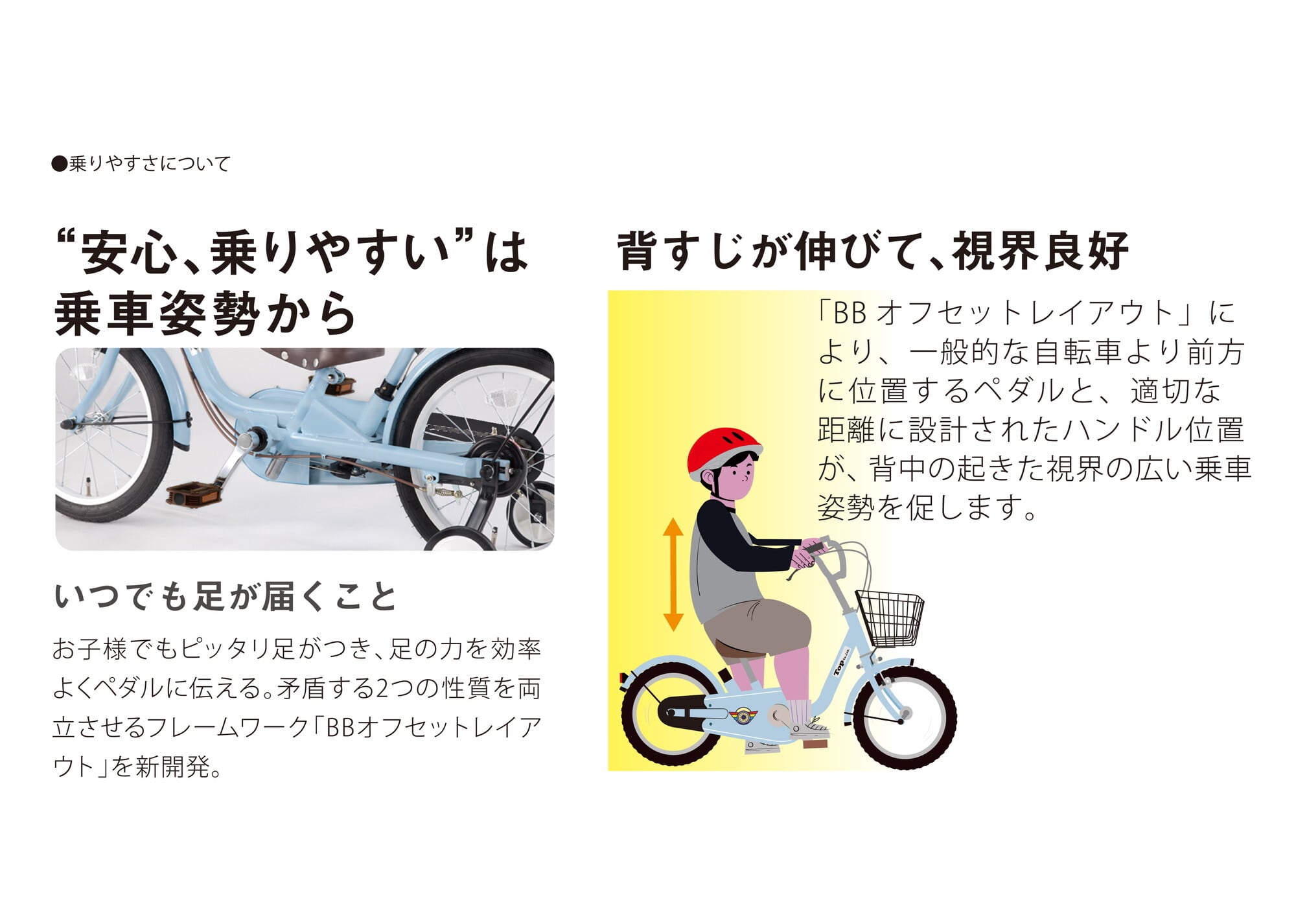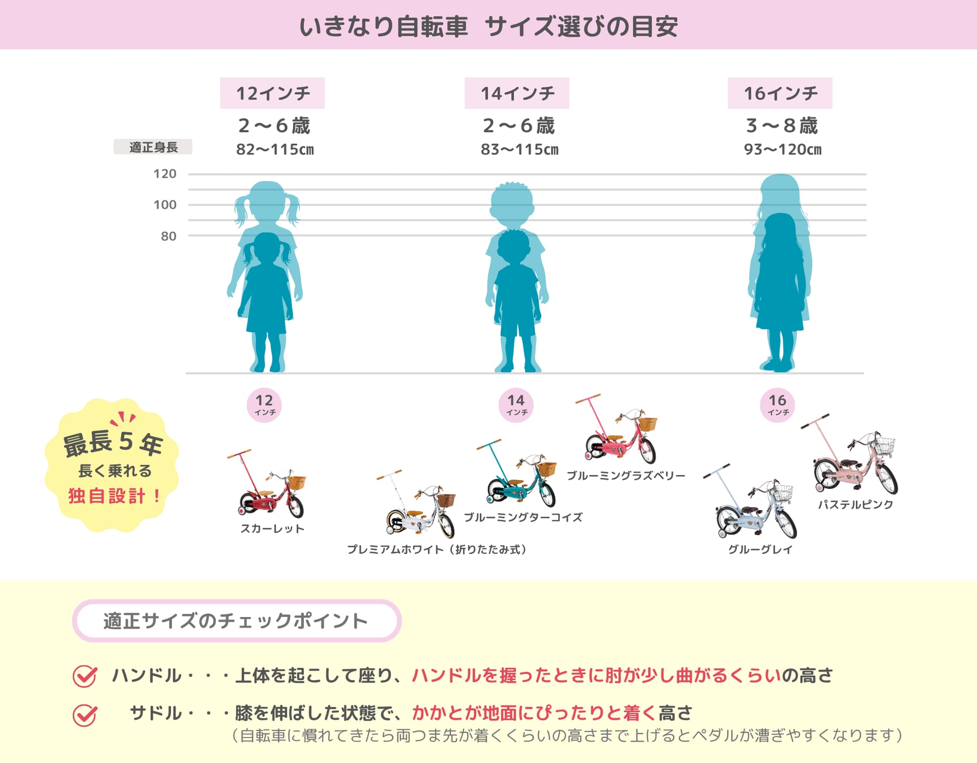 通常3年で乗り換えと言われる幼児用自転車ですが、いきなり自転車は身長が伸びても窮屈にならず乗りやすい姿勢を保つ独自機構を採用しているため、最長5年長く乗ることができます。買い替えのタイミングも遅くなり、次にもう一回り大きい自転車の購入や、買い替え頻度を低くすることも期待できます。
