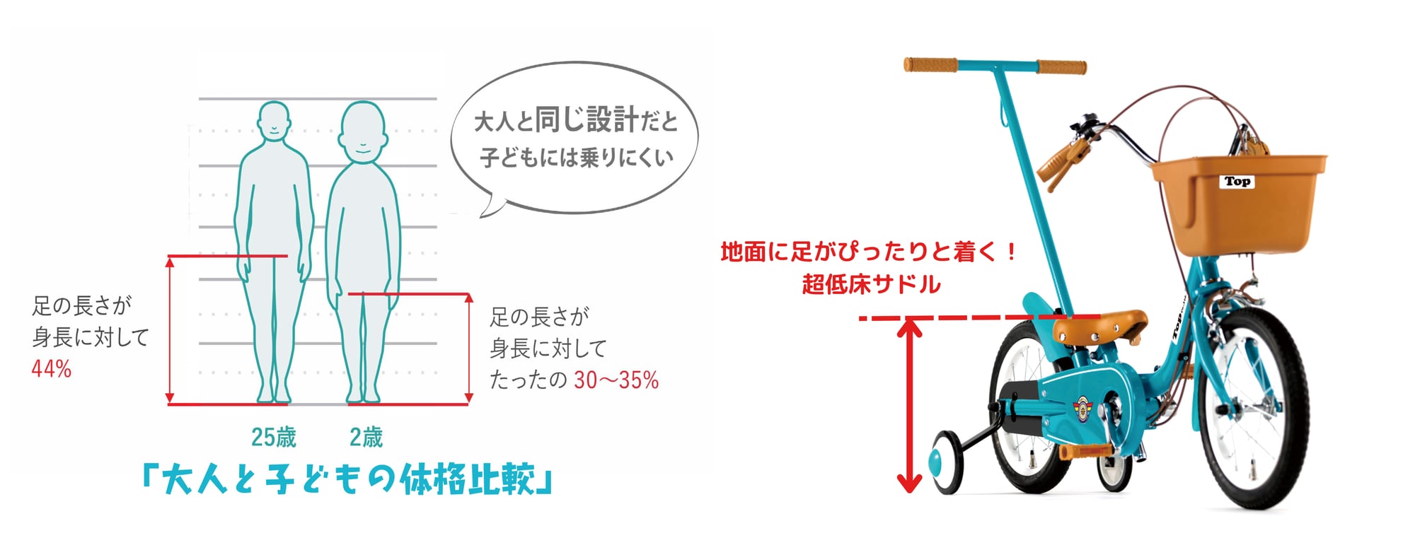 大人が楽な姿勢で、自転車を押す・進行方向をコントロールできる「かじとり式 押し手棒」を装備しています。自転車に乗り始めたばかりのお子さまと、近所や公園へお散歩をしながら練習する際に役立ちます。