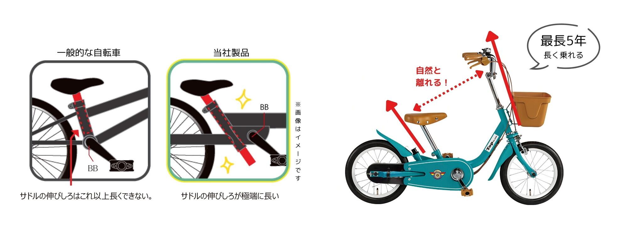 通常3年で乗り換えと言われる幼児用自転車ですが、いきなり自転車は身長が伸びても窮屈にならず乗りやすい姿勢を保つ独自機構を採用しているため、最長5年長く乗ることができます。買い替えのタイミングも遅くなり、次にもう一回り大きい自転車の購入や、買い替え頻度を低くすることも期待できます。